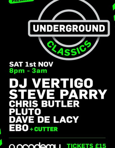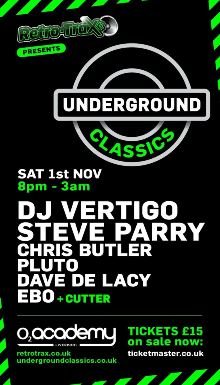 Liverpool's premier old SKOOL event Retro Trax returns with a new concept UNDERGROUND CLASSICS were we bring in some legendary DJ's & acts from back in the day to dig a bit deeper and play the forgotten / underplayed sounds of yesteryear from the late 80s early 90s covering all genres so expect so very cool tunes at #O2Academy2Liverpool on Sat Nov 1st 8pm - 3am Kicking things off with 2 huge local north west legends DJ VERTIGO & Steve Parry & Retro Trax resident DJ's PLUTO , EBO , Chris Butler & Dave De lacy & our host the voice himself CUTTER.